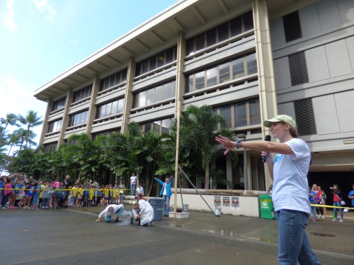 P1100187 Next Published July 11, 2018 at 4608 × 3456 in Outreach Asking questions and talking about how volcanoes work, as the team sets up the demo