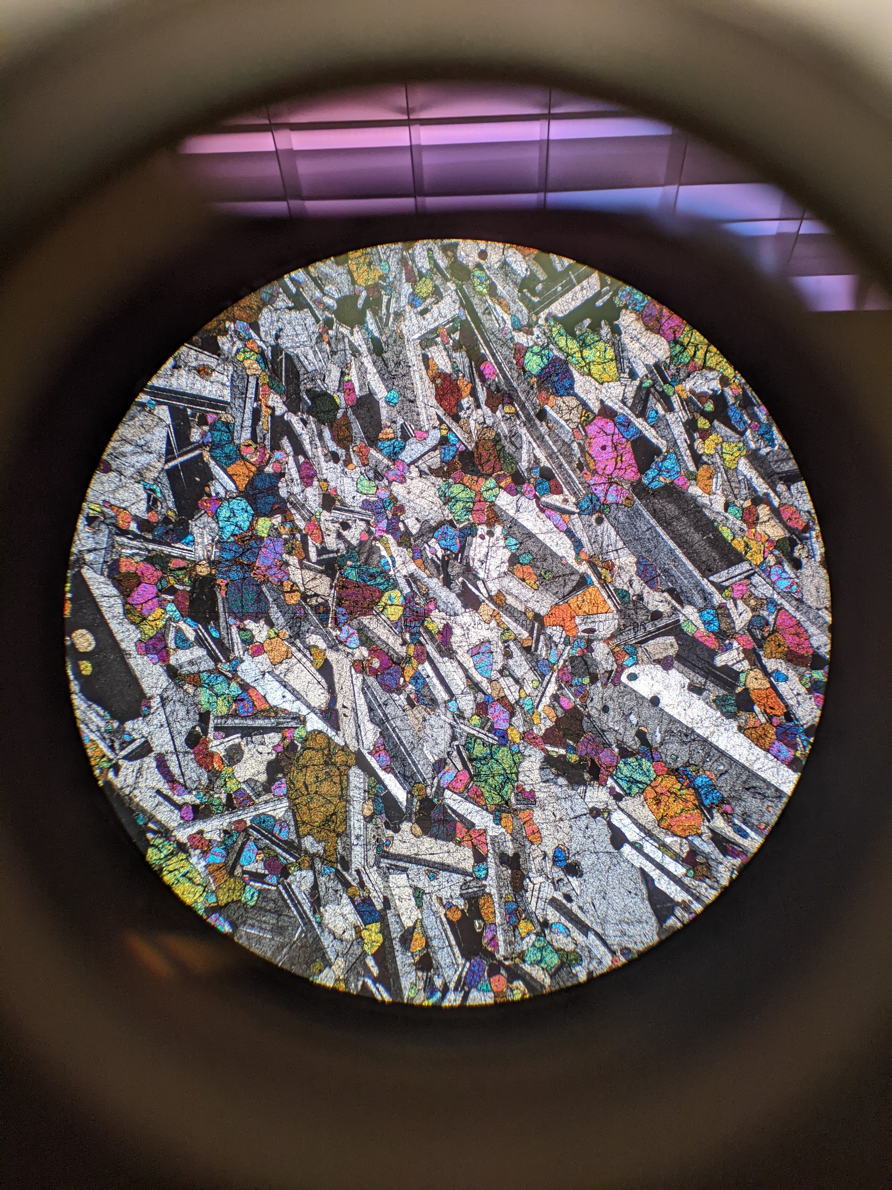 olivineplagrock Previous Next Published February 29, 2024 at 3024 × 4032 in Teaching A random thin section used for Petrology — lots of plagioclase, a little clinopyroxene, and a significant scattering of olivine crystals